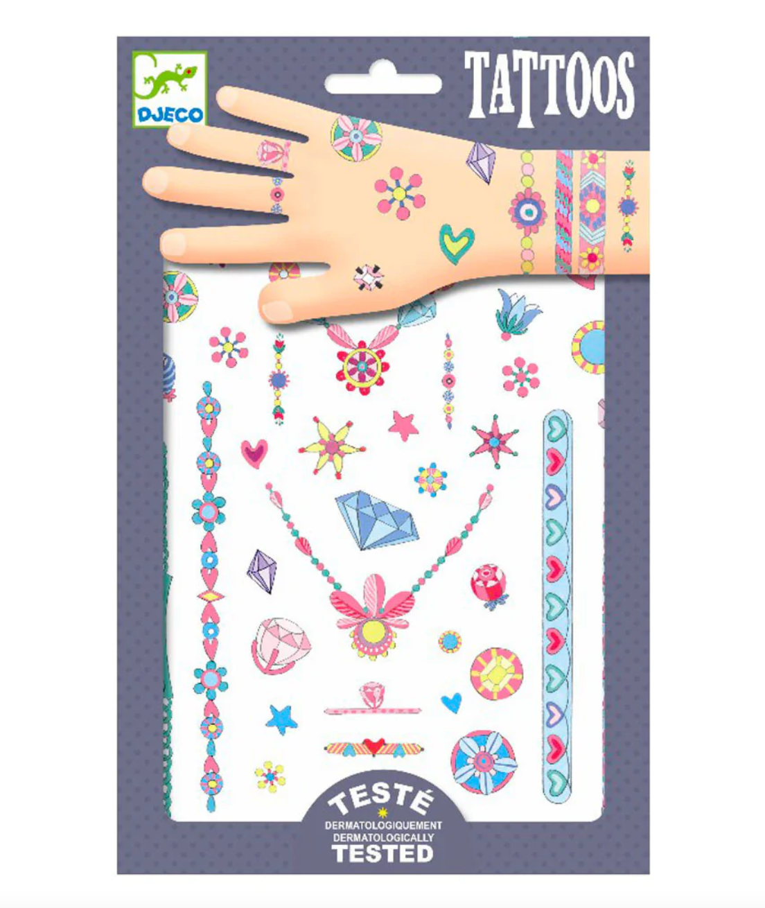 Denne dejlige pakke med tatoveringer er fra Djeco og med dejlige motiver. Pakken indeholder 2 ark fyldt med smukke tatoveringer med motiver af fine smykker og neondetaljer. De er lette at bruge; Skær bare det ønskede motiv ud, fjern filmen, påfør tatoveringen på huden og derefter let den med vand.