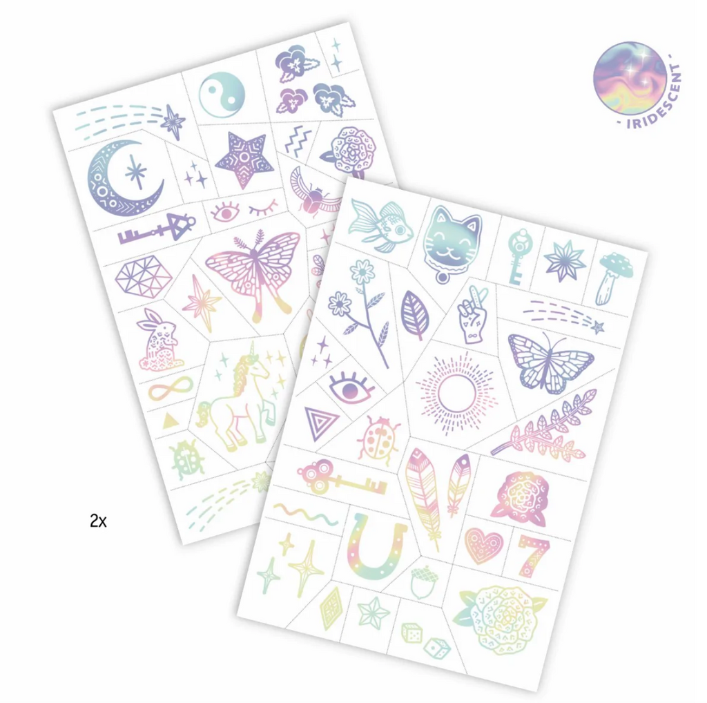 Denne fine pakke med tatoveringer er fra Djeco og med pæne motiver. Pakken indeholder 2 ark fyldt med smukke tatoveringer, som i et simpelt træk skifter smukt i farve, hvilket giver et fantastisk look. De er lette at bruge; Du skal blot skære det ønskede motiv ud, fjerne filmen, anvende tatoveringen på huden og derefter let den med vand.