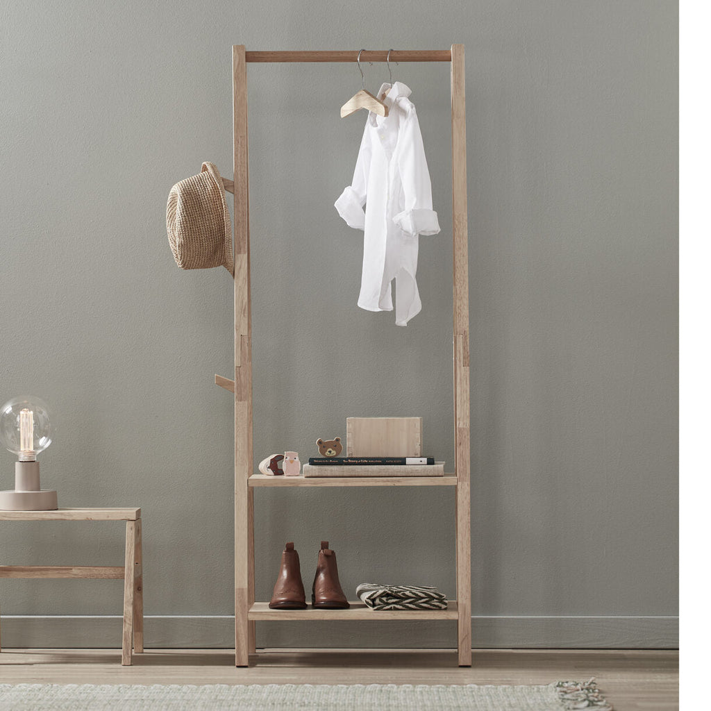 fremragende, praktisk og minimalistisk tøjstativ af kvalitetstræ fra Kid's Company. Tøjstativet har en bar, to hylder og to kroge, så det passer ind i alle børns værelser. Velegnet til børn mellem 3 og 8 år.