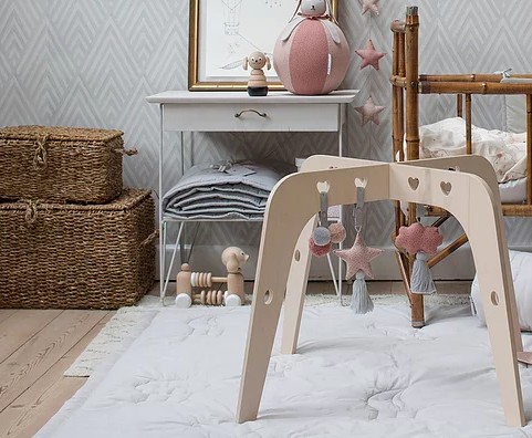 3 Vedhæng til aktivitetsstedet, let at tage på med en kanallukning. De er meget elastiske, så intet sker, hvis den lille ville få fat i en. Der er et vedhæng med skyer, en med stjerne og en med bløde pompomer. Det kommer i en dejlig stofpose.